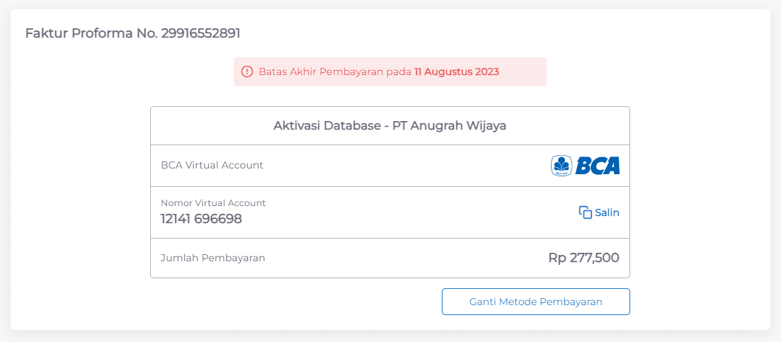 Untuk pembayaran Anda dapat rubah dengan klik “Ganti Metode Pembayaran” yaitu tersedia :