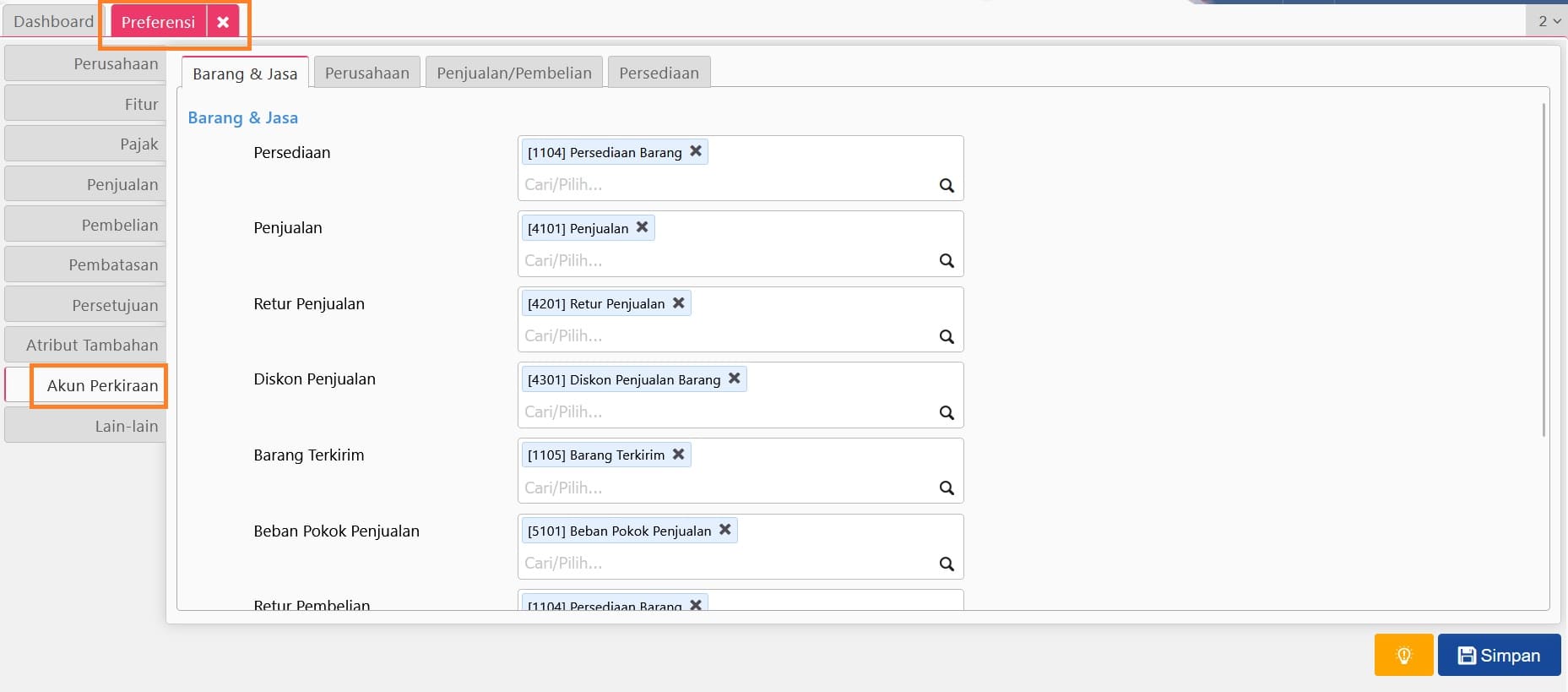 Untuk melakukan pengaturan ini Anda dapat masuk ke menu PengaturanPreferensi & klik Akun Perkiraan.