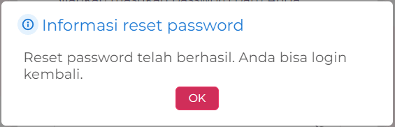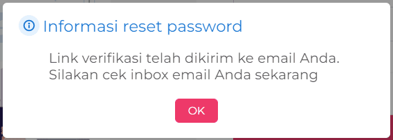 4. Maka akan muncul Informasi reset password “Link verifikasi telah dikirim ke email Anda. Silakan cek inbox email Anda sekarang”, lalu klik OK.