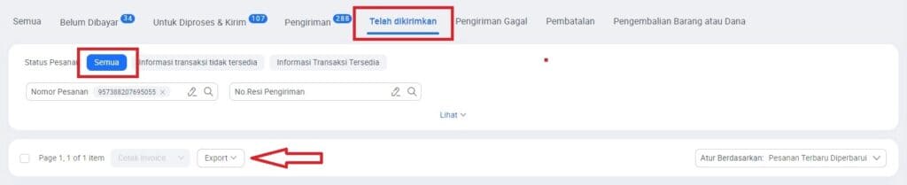 Ekspor data penjualan dari Lazada untuk dapat melakukan import data penjualan ke Accurate Online. Masuk dan akses ke https://sellercenter.lazada.co.id/ seperti yang dilakukan pada Tampilan Lama Penjual, namun di menu Pesanan, pilih ‘Semua’ dan klik pada ‘Sudah Dikirim’ kemudian klik ‘ekspor’.