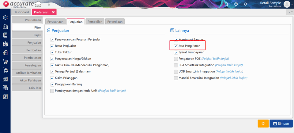 2. Silahkan aktifkan dahulu Fitur Pengiriman, melalui menu Pengaturan | Preferensi – tab Fitur dan klik tab Penjualan, silahkan centang jasa pengiriman.