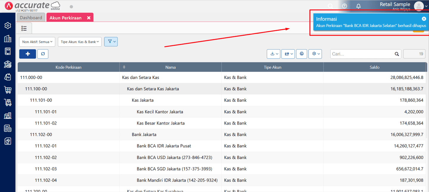 Alternatif Menonaktifkan: Jika Anda tidak yakin untuk menghapus akun secara permanen, pertimbangkan untuk menonaktifkan akun tersebut. Dengan menonaktifkan, Anda dapat menjaga data tanpa menampilkannya dalam laporan keuangan.