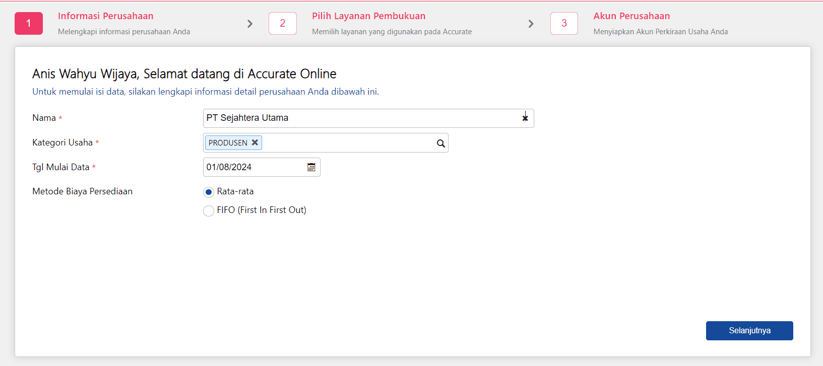 2. Setelah Anda lengkapi, klik Lanjut untuk menuju wizard Akun Perusahaan.